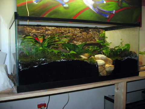 false bottom design with a small river seperated by two pieces of plexi siliconed in place, with a pump and fogger to go along.